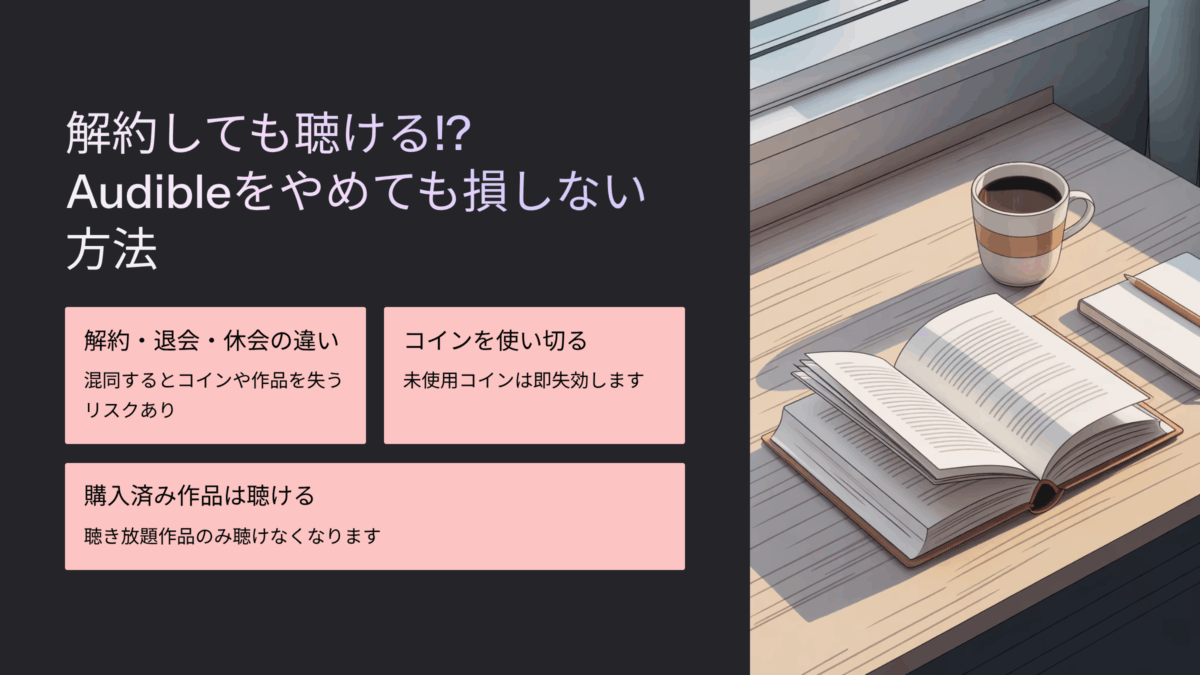 「退会と解約って違うの?」「解約したら購入済みのタイトルも聴けなくなるの?」「残ってるコインや特典はどうなるの?」——。