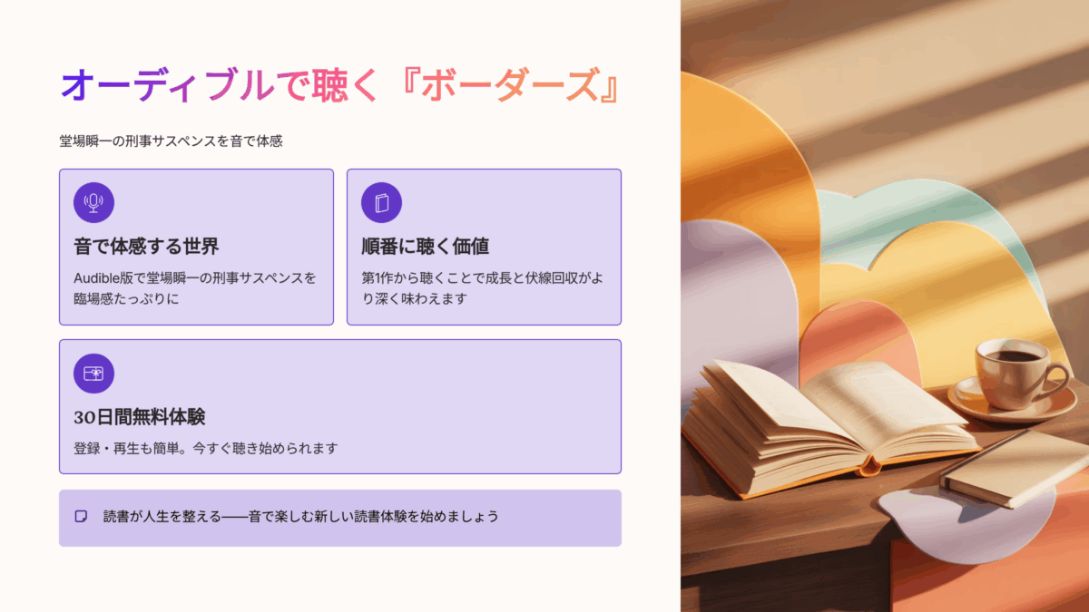 まるで自分が事件現場に立っているかのような臨場感──それがAudibleで聴く『ボーダーズ』の醍醐味です。