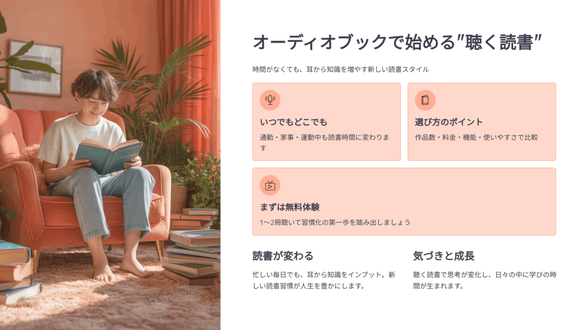 👉 小さな一歩として、今日からオーディオブックの無料体験を始めてみましょう。