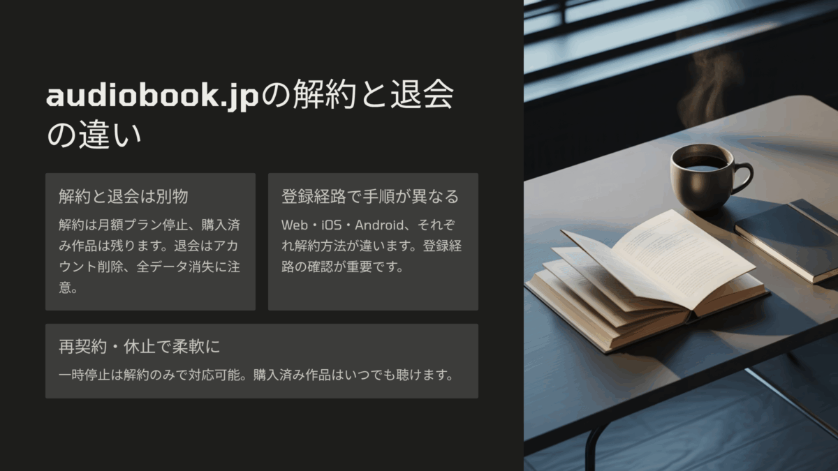 たとえば audiobook.jp の「聴き放題プラン」や「月額会員プラン」を解約しても、