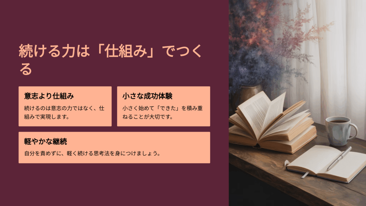 この本は、「続けること」を“がんばり”ではなく“仕組み”に変えるための一冊です。