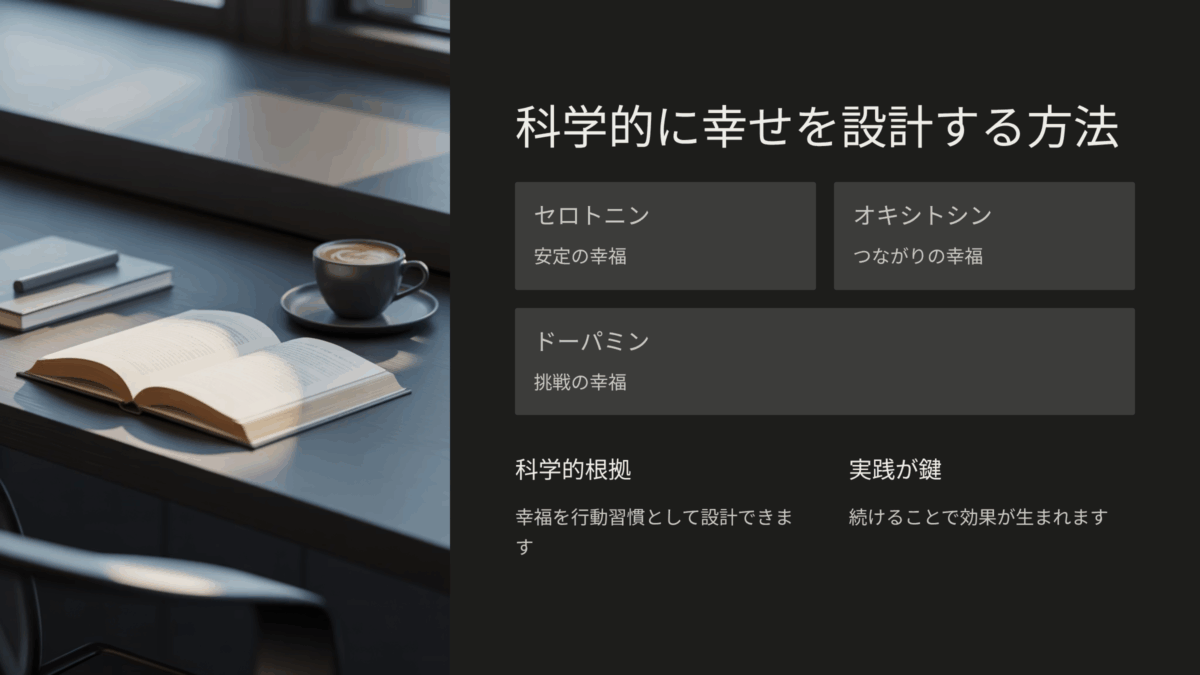 本書の最大の特徴は、“幸福”を3つの科学的メカニズムで分解した点にある。