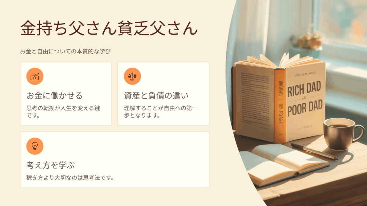 資産と負債の違い、キャッシュフローの考え方、そして経済的自由のマインドセットを教えてくれます。